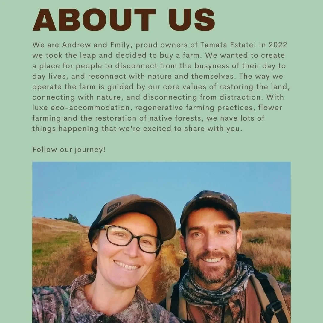 View fullsize We are Andrew and Emily, proud owners of Tamata Estate! In 2022 we took the leap and decided to buy a farm. We wanted to create a place for people to disconnect from the busyness of their day to day lives, and reconnect with nature and themselves. Th